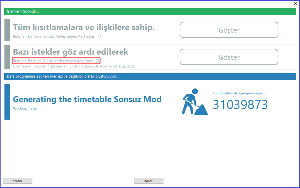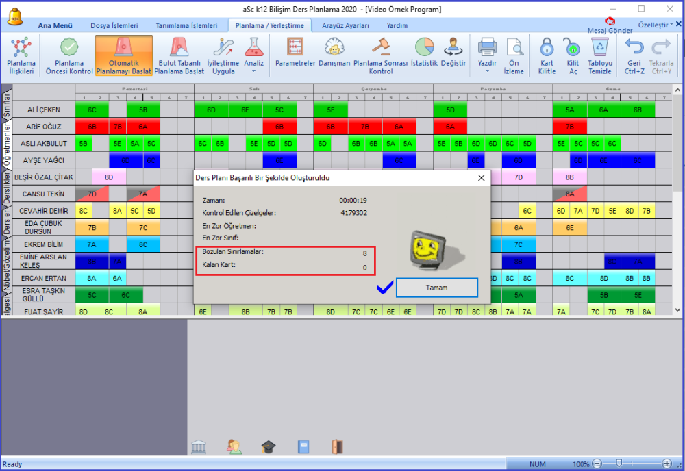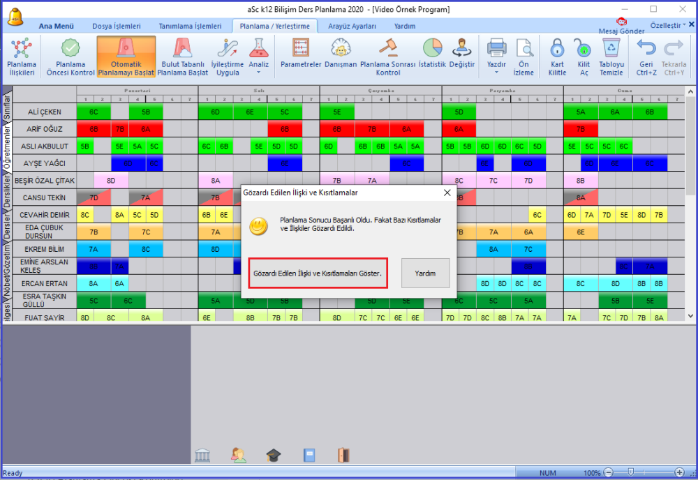 Otomatik planlamada planlama başarılı fakat göz ardı edilen ve bozulan sınırlamalar varsa aşağıdaki resimde kırmızı çerçeve içindeki gibi gösterilmektedir. Örneğimizde 8 kısıtlama bozulmuş durumda.