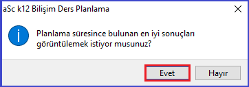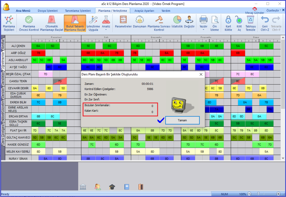 Tekrar ‘Evet’ butonuna tıkladığınızda program tarafından şimdiye kadar oluşturulmuş ders programını görüntüleyebilirsiniz. Aşağıdaki resimde yerleşmeyen kart kalmadığını görmektesiniz.