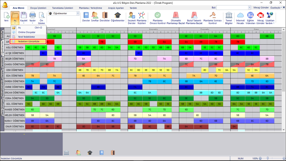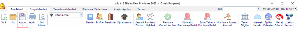 aSc Timetables Ders Planlama programında ders programı hazırlarken belirli aralıklar ile, “Kaydet” butonu ya da “Ctrl+s” kısayol tuşu ile yedekler almalısınız.