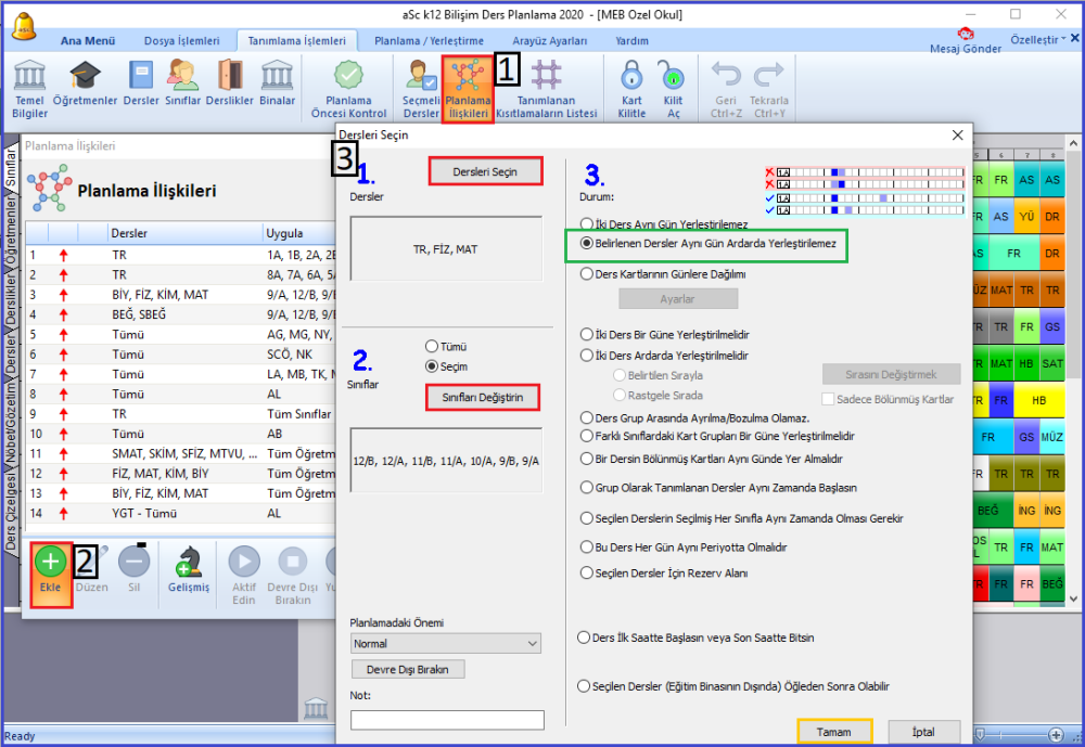 Ana menüde bulunan “Planlama İlişkileri” butonuna tıkladığınızda açılan pencerede 2. adımda gösterildiği gibi “Ekle” seçeneğini seçtiğinizde 3. adımdaki gibi bir pencere daha açılmaktadır. Burada ‘Dersler’ alanından matematik, fizik gibi dersleri ve ‘Sınıflar’ butonundan da bu ilişkiyi uygulamak istediğiniz sınıfları seçmeniz gerekmektedir.