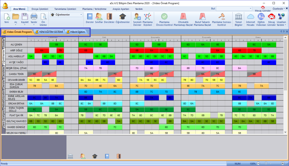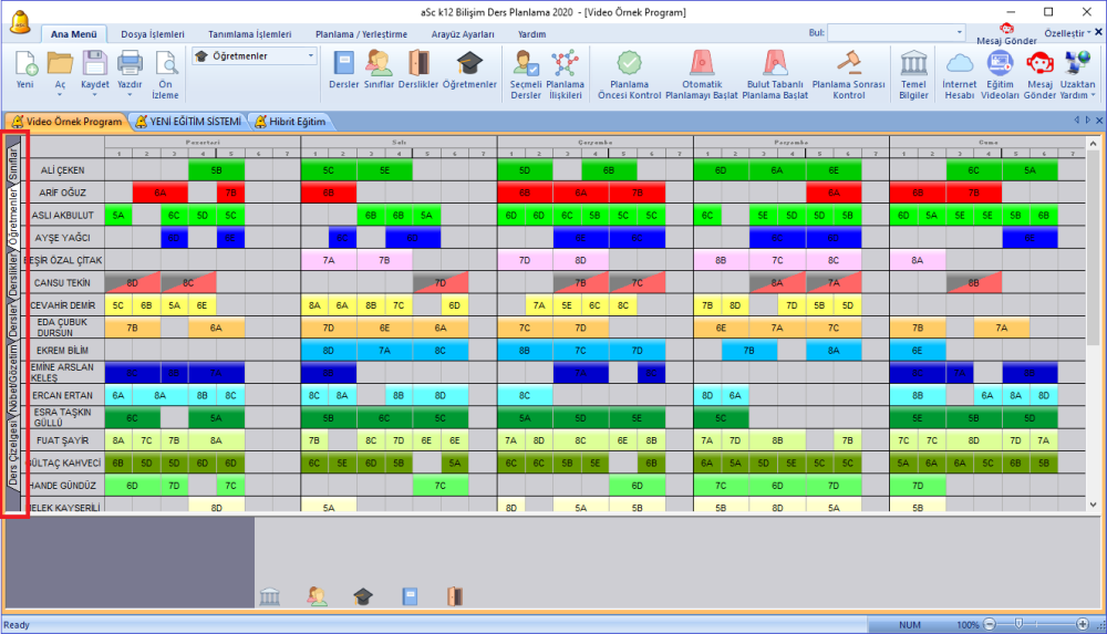 Aşağıdaki resimde kırmızı ile belirtilen sol taraftaki sekmeler sınıflar, öğretmenler, dersler, dersliklerin çarşaf listelerine erişebilirsiniz. Farklı bir pencere açıp kapatmanıza gerek kalmadan tüm okulun programını aynı anda görüntüleyebilirsiniz.