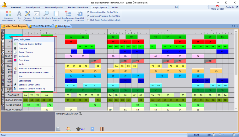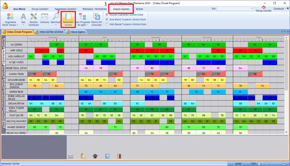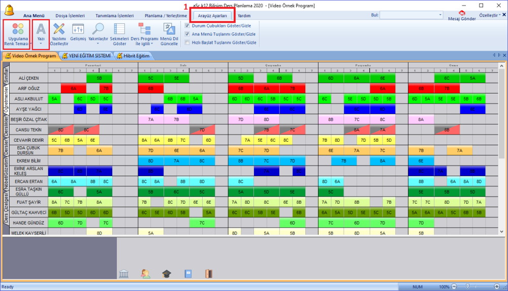 aSc Ders Planlama Programının Çalışma ekranında her öğretmen bir renk ile temsil edilir. Buda sizin ekrandaki dersleri kolaylıkla ayırt etmenizi sağlar. Eğer bu renkleri değiştirmek isterseniz ya da ekranınızı alışık olduğunuz siyah beyaz bir görüntü ile kullanmak isterseniz bu ayarları nasıl gerçekleştireceğinize dair eğitim içeriğine tıklayarak ulaşabilirsiniz.
