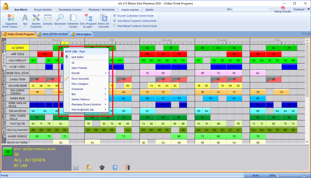 aSc Timetables Ders Planlama Programında farenin sağ tık özelliği aktiftir. Aşağıdaki resimde görüldüğü gibi Çalışma Ekranında herhangi bir kartın (Ders) üzerine gelip sağ tıklayarak açılan menüden ders ile ilgili güncellemelere kısa yoldan erişebilirsiniz.