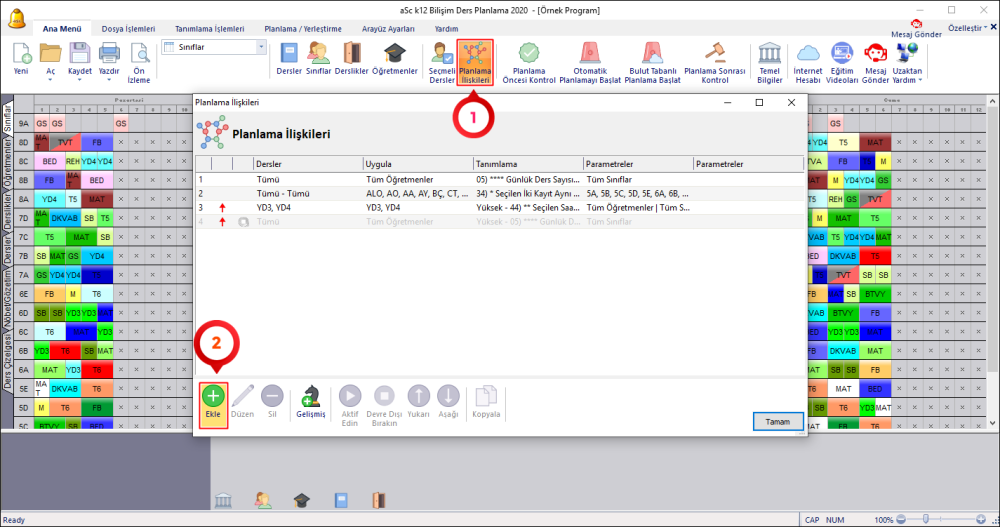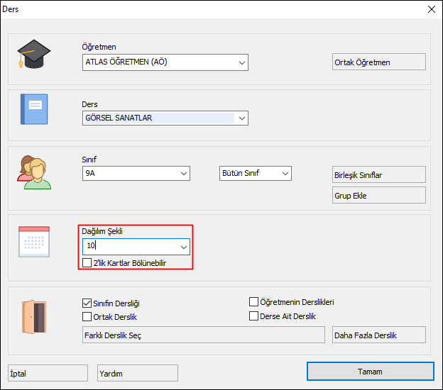 1*(ders saati) olarak yaptığımız bu düzenleme sayesinde 10 saat ve üzeri dersler için blok ders oluşturabilirsiniz. Fakat otomatik planlama yaptığınız zaman bu blok dersimizi 1’lik kartlar olarak tanımladığımız için farklı gün ve farklı saatlere dağıtılacaktır.
