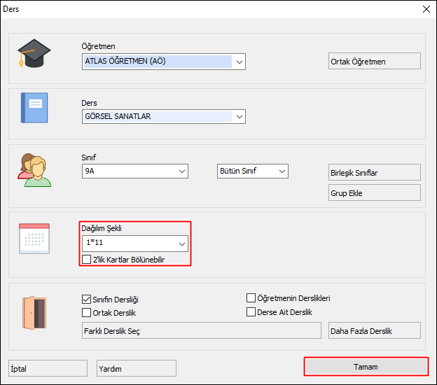2) Kartların Günlük Ve Haftalık Yerleşimini Sınırlandır Özelliği ile 1’lik olarak bölmüş olduğunuz 11 saatlik blok dersinizin kartlarının bir günde veya bir haftada kaç saat olmasını istediğinize karar verebilirsiniz.