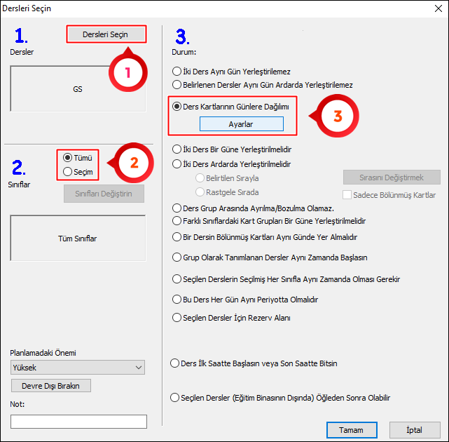 3) Ders Kartlarının Günlere Dağılımı Özelliği sayesinde kartların dağılım şeklini manuel olarak seçebilirsiniz.