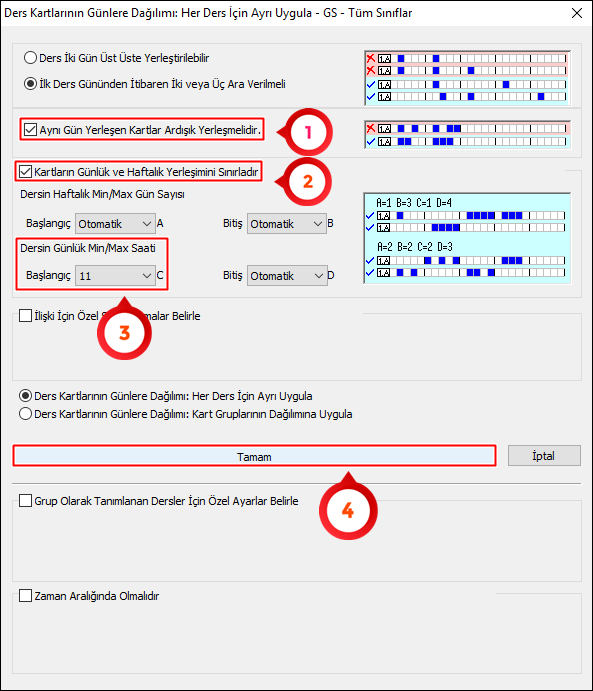 3) Dersin Günlük Min/Max Saati Özelliği ile dersinizin günlük kaç saat olacağını belirleyebilirsiniz. Burada 11 yazmamızın nedeni bu dersin bir güne en az 11 saat olarak gelmesini istiyoruz ve işaretlemiş olduğumuz Aynı Gün Yerleşen Kartlar Ardışık Yerleşmelidir özelliği ile de dersinizin yerleştiği gün kartlarınız art arda gelecek şeklide dağılmasını sağlıyorsunuz.
