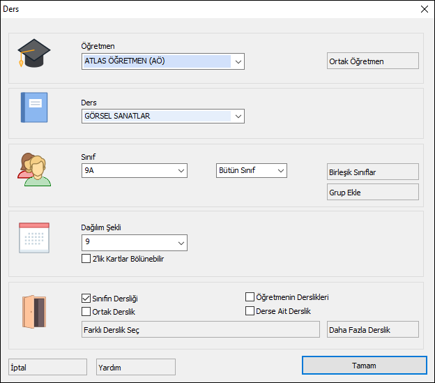 Örnek olarak burada Atlas öğretmenimize verilen 9 saatlik bir blok ders tanımlamasını inceleyelim.