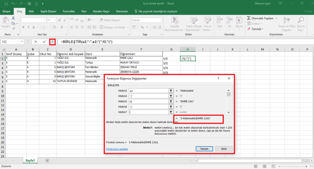 yine birleştirme özelliğini kullanarak bu sefer sınıf düzeyi, ders ve öğretmen adını birleştireceğiz.
