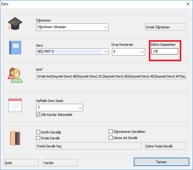 Bölüm kapasitesi alanından grup kapasitelerini sınırlandırabilirsiniz.