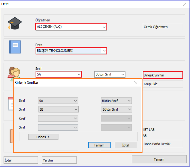 Bu pencerede, öğretmeni, dersi ve dersin haftalık saatini seçtikten sonra “Birleşik Sınıf” butonu ile derse dahil edilecek sınıfları seçiyoruz.