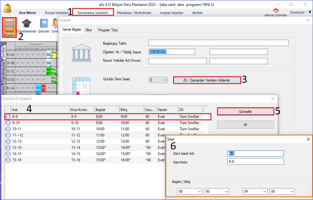 Ders saatlerini tanımlama işlemi için, “Ana Menü” ve “Tanımlama İşlemleri” menüsünde de bulunan ‘Temel Bilgiler’ butonundan ‘Zil/Zamanları Yeniden Adlandır’ seçeneğine tıklayarak açılan pencerede tek tek her kaydın üzerine tıklayarak ‘Güncelle’ butonunu seçerek saat aralığı girebilirsiniz.
