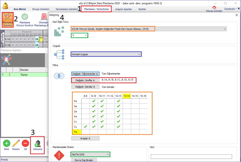 Öncelikle “Ana Menü” ve “Planlama/Yerleştirme” menüsünde de bulunan ‘Planlama İlişkileri’ butonuna tıklıyoruz. Açılan pencerede ‘Gelişmiş’ butonuna tıklayarak 2 numaralı kart ilişki türü ‘Bir Periyot İçinde Seçilen Değerden Fazla Kart Sayısı Olamaz’ ilişkisini seçiyoruz.
