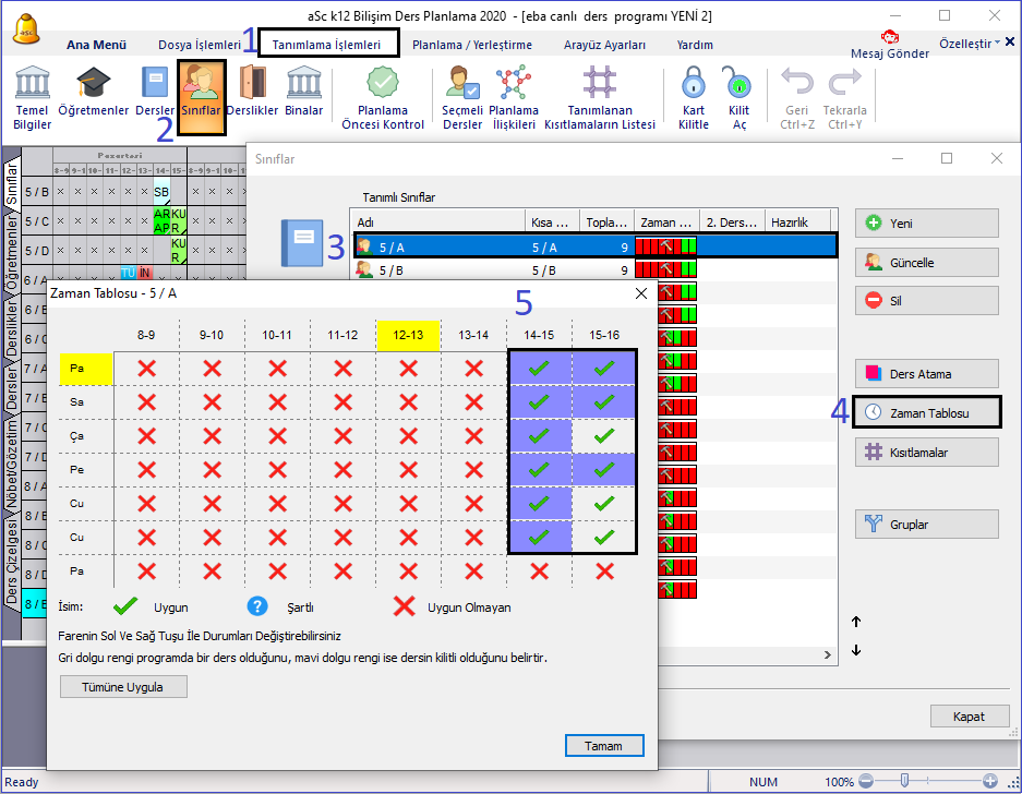 Bunun için de yine “Tanımlama İşlemleri” menüsünde bulunan ‘Sınıflar’ butonuna tıkladığınızda açılan pencerede sınıfları seçip ‘Zaman Tablosu’ na tıklayarak eğitim verilecek saat aralıklarını yeşil tik ile işaretlemektir. (X ile işaretli alanlar ders yerleştirilemeyecek periyotları, ? ile işaretli alanlar ise sadece gerektiği durumda ders yerleştirilebilecek periyotları ifade eder.)