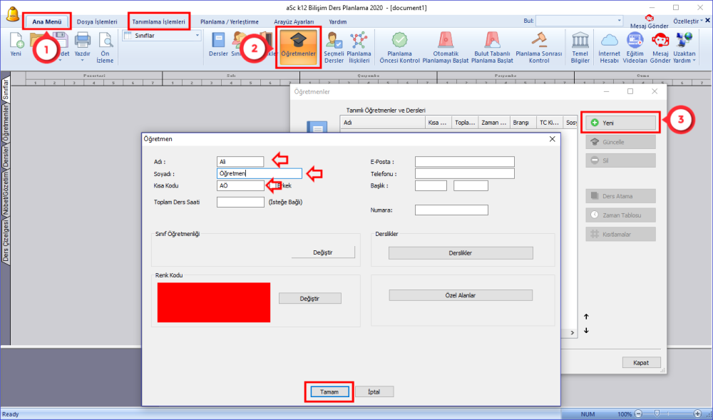 Ardından Yeni butonuna tıklayarak, açılan pencerede ekleyecek olduğunuz öğretmenin Adını Soyadını ve Kısa Kodunu yazarak, temel olarak öğretmen ekleme işlemini tamamlamış olursunuz.