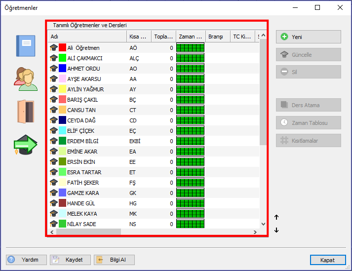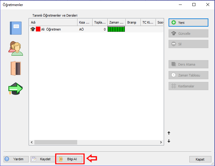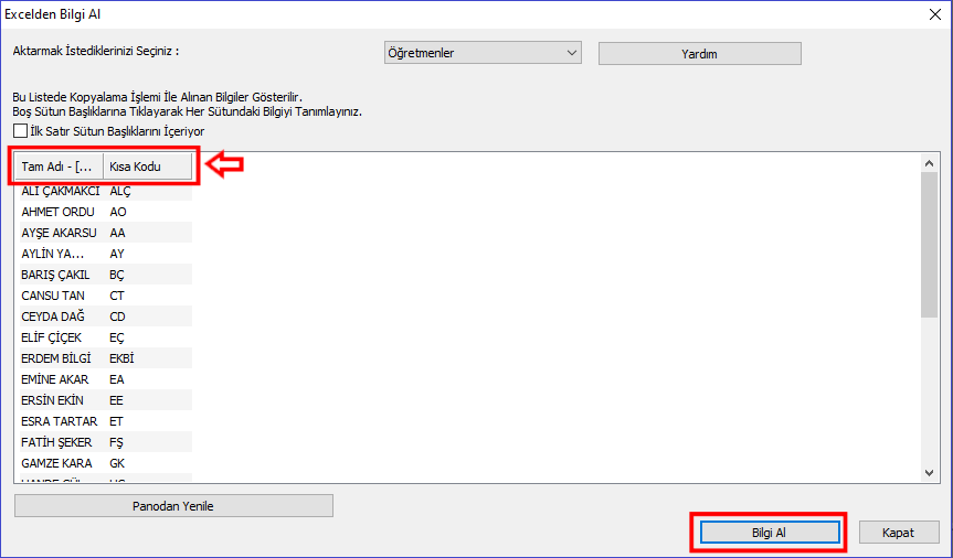 Ardından aSc Timetables programınızda bulunan Öğretmenler butonuna tıklayarak, açılan pencereden Bilgi Al butonuna tıklamalısınız. excelden Kopyala/Yapıştır ile öğretmenlerinizi toplu olarak ekleyebilirsiniz.