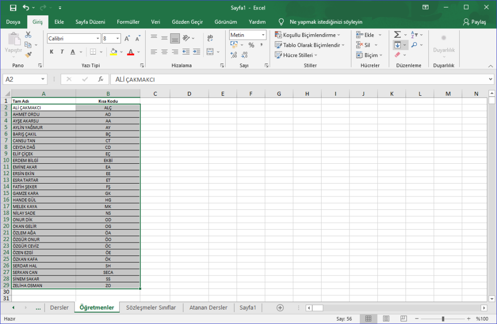 Bunun için öncelikle aşağıdaki resimde göründüğü gibi, öğretmenlerinizin sütun halinde isim listesinin olduğu bir excel dosyanızın olması gerekmektedir. Dilerseniz aynı excel dosyasında bir sütun olarak da, öğretmenlerinizin programda temsil edileceği isimlerinin kısaltmalarını da ekleyebilirsiniz. Excelde öğretmen kısaltmalarının mükerrer olmadığına dikkat etmeniz gerekmektedir.