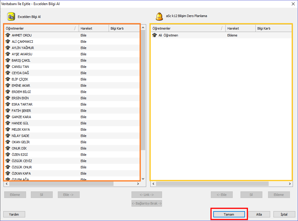 Tamam butonuna tıklayarak öğretmen bilgilerinizi toplu bir şekilde eklemiş olursunuz.