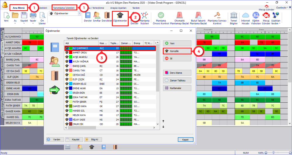 Öğretmenlerin özel alanlar penceresine ulaşmak için, “Ana Menü” ve “Tanımlama İşlemleri” menüsünde de bulunan, “Öğretmenler” butonuna tıklamalı ve tanımlı öğretmenlerinizden birini seçerek, “Güncelle” butonuna tıklamalısınız.