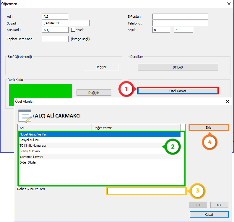 Bu başlıkta öğretmenlerin nöbet günü, sosyal kulübü, branş/unvan gibi bilgilerinin girişini yapabileceğiniz özel alanlar seçeneğinden bahsedeceğiz.