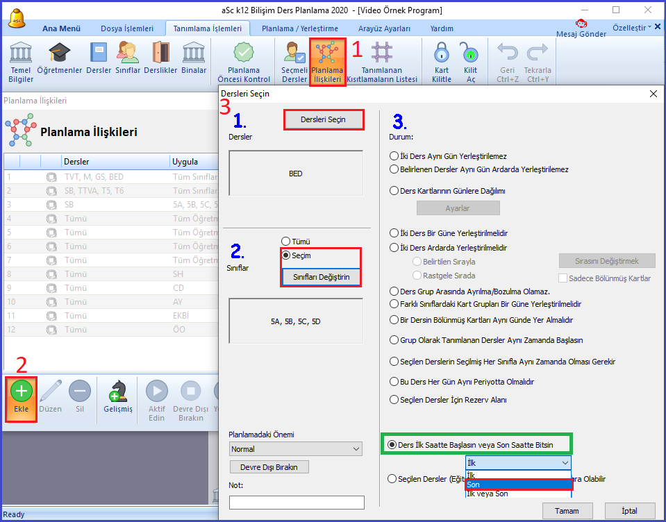 Bunun için “Planlama İlişkileri” sekmesine tıkladığınızda açılan pencerede “Ekle” butonuna bastığınızda aşağıdaki gibi bir pencere açılmaktadır. Burada kırmızı çerçeve içerisindeki adımları takip ederek 3. adımlarda bulunan seçim butonlarından bu ilişkiyi uygulayacak olduğunuz sınıfları ve beden eğitimi dersini seçmeniz gerekmektedir.