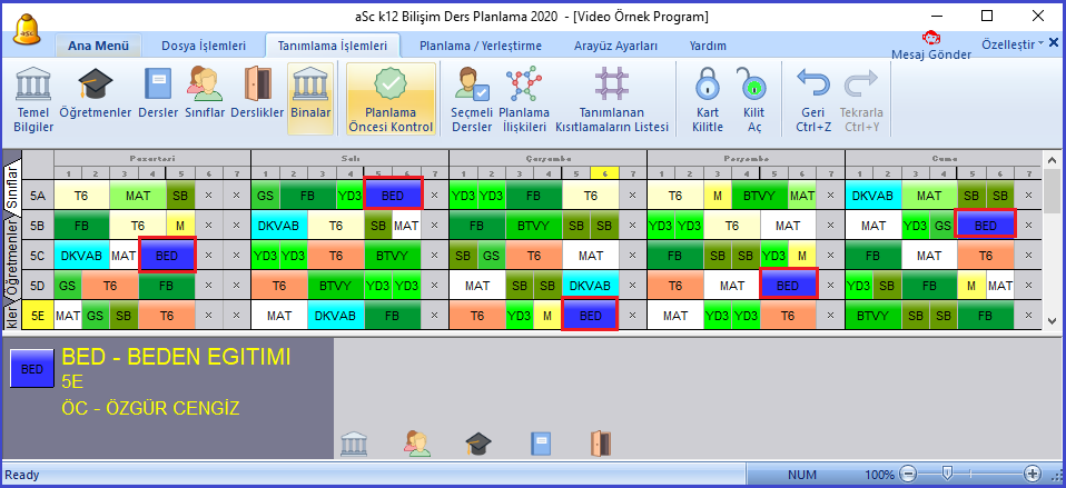 ‘Tamam’ butonuna basıp bir planlama yaptığınızda aşağıdaki resimde görüldüğü gibi beden eğitimi dersinin son saatlere yerleştiğini görebilirsiniz. aSc Ders Planlama Programı’nda nasıl planlama gerçekleştirileceği ile ilgili anlatımlar “A.10) Otomatik Planlama” bölümünde mevcuttur. Daha detaylı bilgi için Tıklayınız.