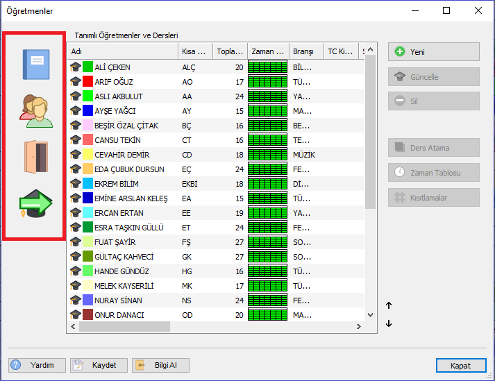 4- Tüm veri girişlerinizi dersler ,sınıflar, derslikler ve öğretmenler bu menüden gerçekleştirebilirsiniz. Aşağıdaki resimde görüldüğü gibi kırmızı çerçeve alanında bu butonların kısa yolları bulunur. Farklı pencere açıp kapatmanıza gerek kalmadan bu menüler arasında kolayca geçiş yapabilirsiniz.