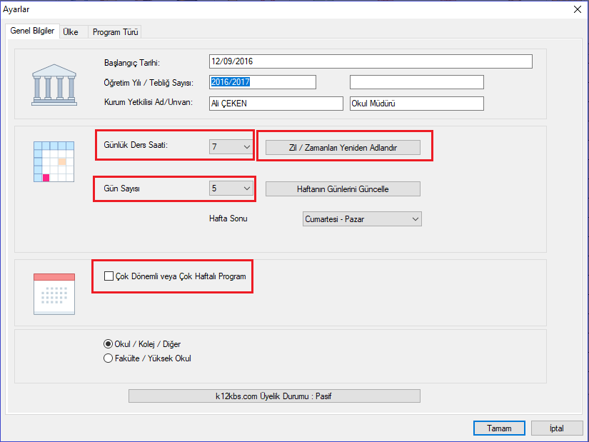 10- Ayrıca aşağıdaki resimde görüldüğü gibi zil saatlerinin ayarlandığı, haftalık gün ve saatlerin belirlendiği, çok haftalı ya da çok dönemli program yapılabilmesini sağlayan Temel Bilgiler butonu Ana Menüde bulunur.