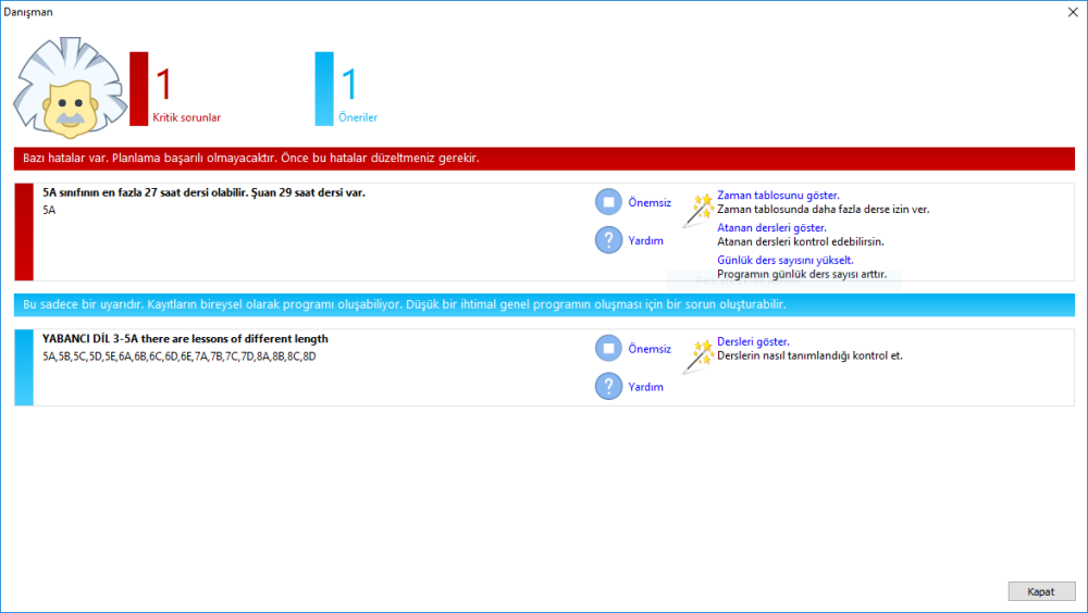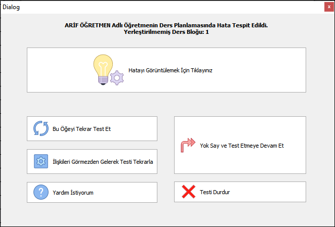 “Planlama Öncesi Kontrol” özelliği ile her sınıfın, öğretmenin ve dersliğin ders programının bağımsız olarak oluşturulup oluşturulamayacağı kontrol edilir.