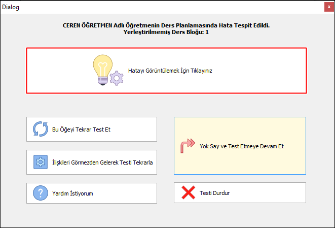 “Planlama Öncesi Kontrol” işleminde Ceren Öğretmenimiz ile ilgili ders kartlarının yerleşemediğine dair uyarı alıyoruz. “Hatayı Görüntülemek için Tıklayınız” butonuna tıklıyoruz.