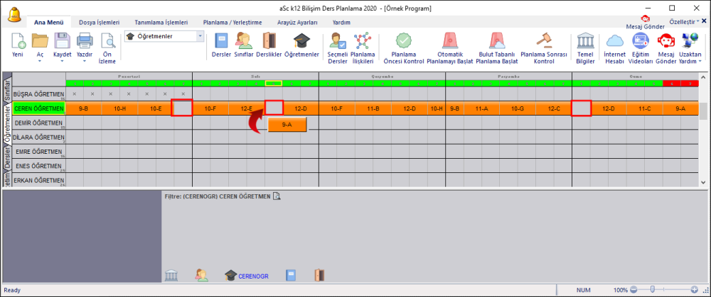 Örnekte görüldüğü üzere, Ceren Öğretmene atanan toplam 34 saat ders bulunmakta. Ve öğretmenin programında, günlük 7 saatten 5 gün 35 saatlik ders yerleşebilecek alan bulunmakta . Buna rağmen öğretmenin yerleşemeyen 1 adet 2 saatlik blok dersi bulunduğunu görüyoruz.