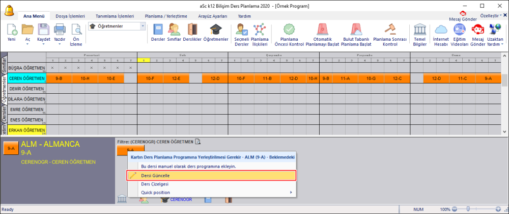 Ceren Öğretmenimizin yerleşmeyen dersi için, dersin üzerinde mouse sağ tuşuna tıklayarak “Dersi Güncelle” seçeneğini seçiyoruz.