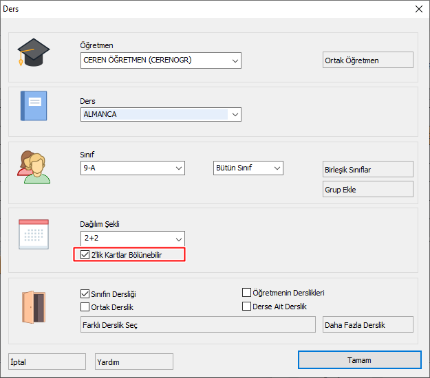 Okulun günlük ders saati sayısı 7. Fakat Ceren Öğretmenin dersleri 2lik Blok dersler halinde. Öğretmenimizin derslerinin yerleşebilmesi için tek sayıda derslere ihtiyacı bulunmakta. Öğretmenimizin derslerinin yerleşebilmesi için en az 4 adet 1 saatlik derse daha ihtiyacı var. Bu durumu çözmek için Ceren Öğretmenin yerleşmeyen 2 saatlik blok dersine “2lik Kartlar Bölünebilir” komutu vermek gerekir.