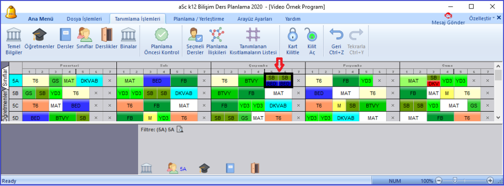 Örneğin, okulunuzda bazı sınıfları alanlarına göre gruplara ayırmış olabilirsiniz. Böyle bir durumda gruplar birbirinden farklı dersleri alıyor ya da bazı dersleri farklı öğretmenlerden alabilmektedir. Aşağıdaki resimde gösterildiği gibi 5/A sınıfının pazartesi günü bir grubu 5. saatte derse girerken diğer grubu din kültürü dersine giriyor ve salı günü de bir grubu 6. saatte sosyal bilgiler dersine girerken diğer grubu eve gitmektedir.