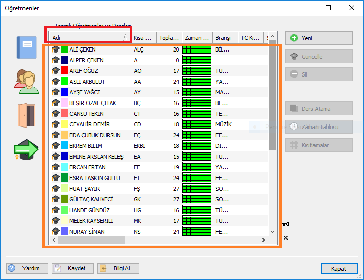 Ders, derslik, sınıflar ve öğretmenler pencerelerinde alfabetik olarak sıralanmasını nasıl sağlarız inceleyelim.