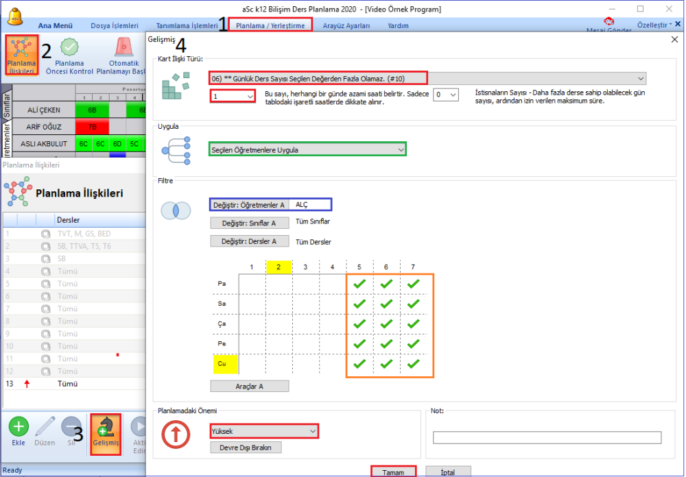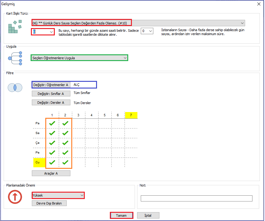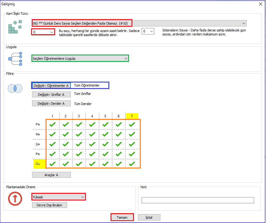 Öğretmenlerimizin ‘Kısıtlamalar’ kısmında bir öğretmen için Min./ Max günlük ders sayısını sınırlandırabilirsiniz. Fakat bu günün tamamını kapsamaktadır. Örneğin, öğretmeniniz öğleden sonraları en fazla 1 saat dersi olsun istiyorsa bunu planlama ilişkisiyle ayarlayabilirsiniz.Örneğimizde herhangi bir öğretmenimizin öğleden sonraları en fazla 1 saat dersi olsun diyelim.